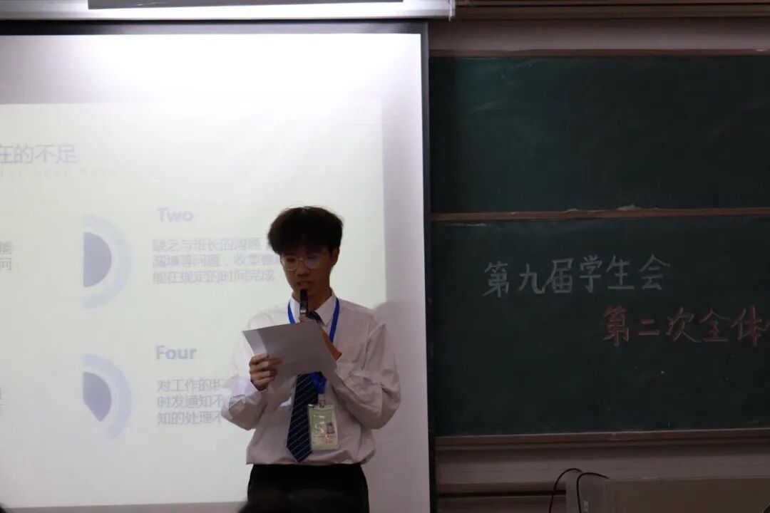 会议伊始,全体起立奏唱国歌。随后,班委部负责人林东良,调研部负责人阳华川,办公室主任许心仪,竞赛部负责人吴洁怡,体育部负责人李梓颖,新闻中心部长刘玉婷依次上台发言,分别介绍了负责部门的主要职责、工作总结情况、对工作的展望以及部门活动回顾。