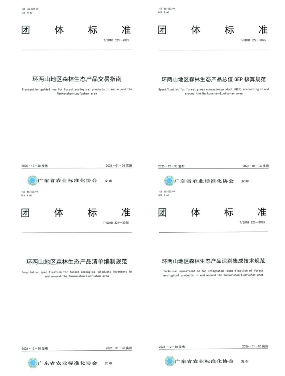经调研、研制、讨论、研究、公示、征求意见、修改完善、专家函审、报批审核,《环两山地区森林生态产品识别集成技术规范》(T/GDNB320-2025)、《环两山地区森林生态产品清单编制规范》(T/GDNB321-2025)、《环两山地区森林生态产品总值GEP核算规范》(T/GDNB322-2025)、《环两山地区森林生态产品交易指南》(T/GDNB323-2025)4项团体标准于2025年12月30日发布,2026年1月6日正式实施。