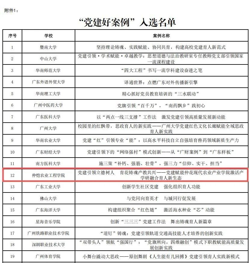本次优秀成果评选活动由省委教育工委主办,面向全省教育系统开展,旨在总结凝练、巩固深化全省教育系统基层党建成果,发挥示范带动作用,引导各级党组织创新工作理念和方式方法,推动形成“典型引领、创新驱动、整体提升”的基层党建新格局,为新时代教育事业高质量发展提供坚强组织保证。此次获评省级“党建好案例”,是对学校党建引领立德树人工作实践的充分肯定。未来,学校将以此次获奖为契机,进一步强化示范引领、着力对照提升、注重常态长效,持续开展“双抓双促”行动,实现育人质量、产业赋能与党建成效同频共振,不断创新“党建+产业+育人”融合范式,把乡村振兴的舞台化作学校立德树人的平台,让师生在产学研用的实践中厚植爱农情怀、锤炼兴农本领,奋力建设“农工并重,科技领先”的新时代特色鲜明高水平应用型大学,为实现广东农业农村现代化贡献“仲恺”力量。