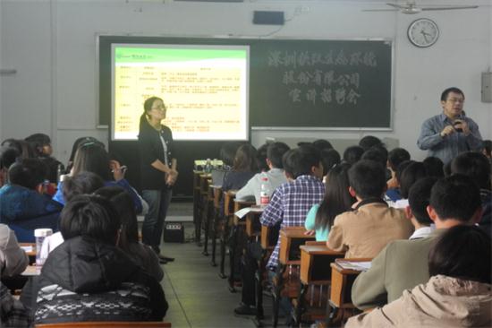 招聘会分宣讲、提问、笔试三个环节进行。宣讲会上,由铁汉公司行政中心人力资源部郭阳老师向在座毕业生详细地介绍本公司的主营业务、组织架构、骨干人员以及公司成功项目,铁汉公司资金雄厚,经营范围立足华南,辐射全国,业绩不断上升,并与多个人民政府和多家企业建立战略合作伙伴关系。同时,他希望在目前因城市空气污染严重而进行的各项绿化城市工程的趋势下,同学们能够通过公司并与之一起努力合作把环境建设得更好。在谈及人才发展战略时,他表明除应聘者自身需具备社会适应能力强,能吃苦有责任心,并且兼备扎实的基础知识等条件外,公司会提供全方位的系统培训、建立导师制度以及进行内部轮岗学习,为员工提供特色辅导和提供更为广阔的发展平台。