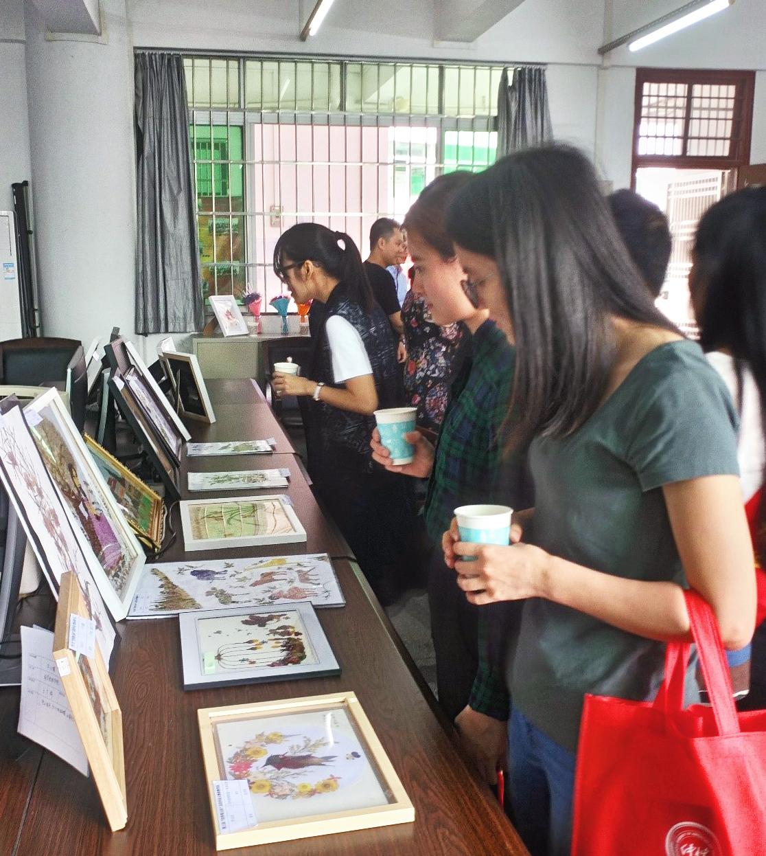 图为williamhill英国校友们观看四季景山压花大赛优胜学生作品。