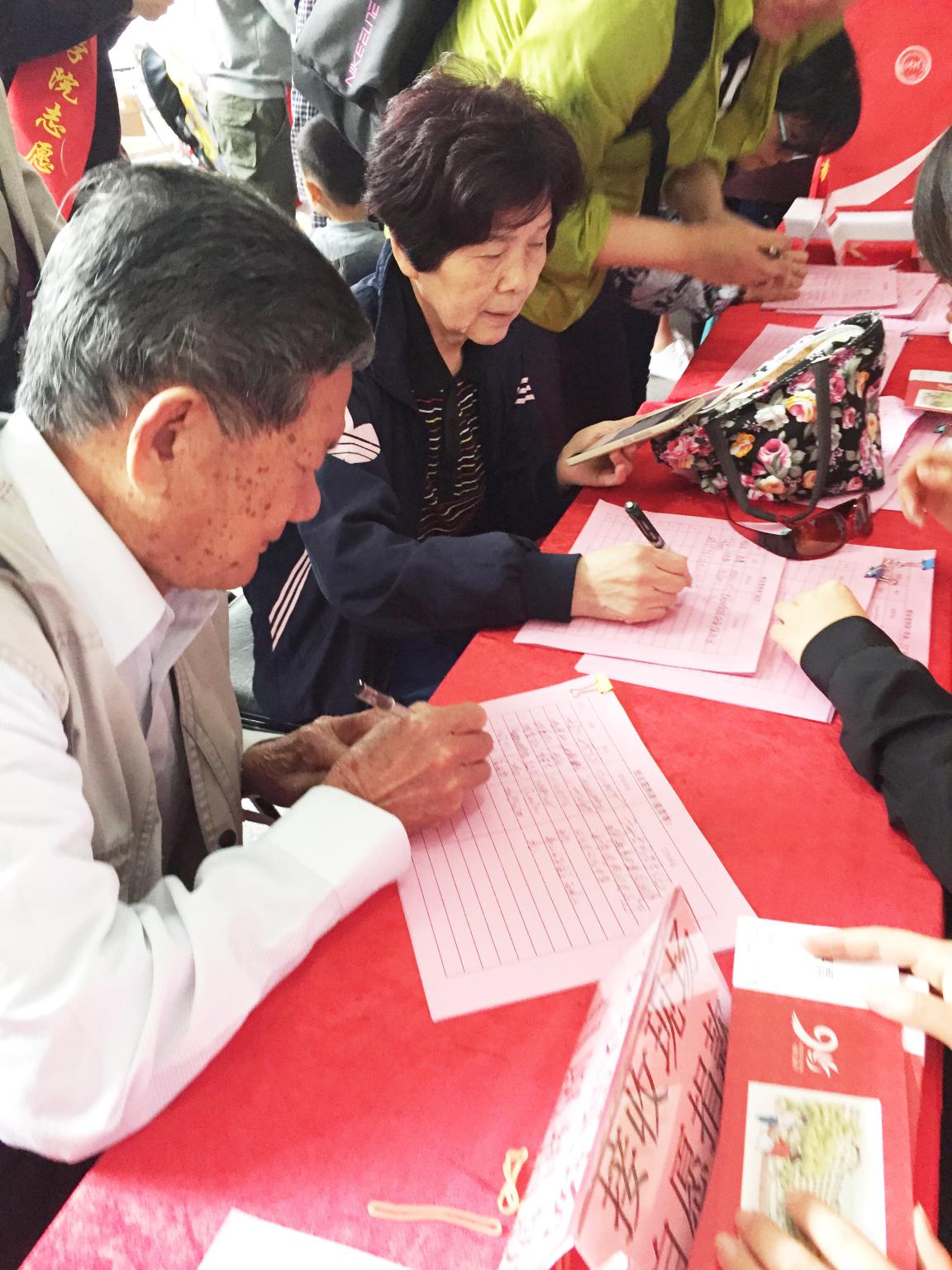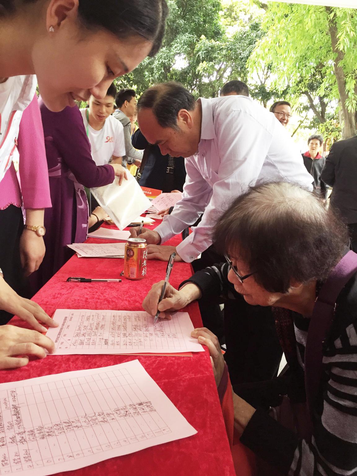 图为williamhill英国老一辈校友早早来到签到现场郑重认真地写下自己的名字
