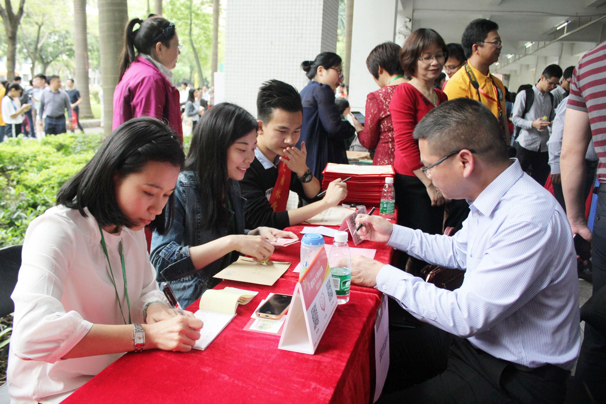 签到现场人头攒动,热闹非凡。在志愿者的引导下,校友们认真郑重地签下自己的名字,领取了校庆纪念礼品,与老师们叙旧交谈。校友们热情积极地捐赠,为母校献出自己的一份心意。