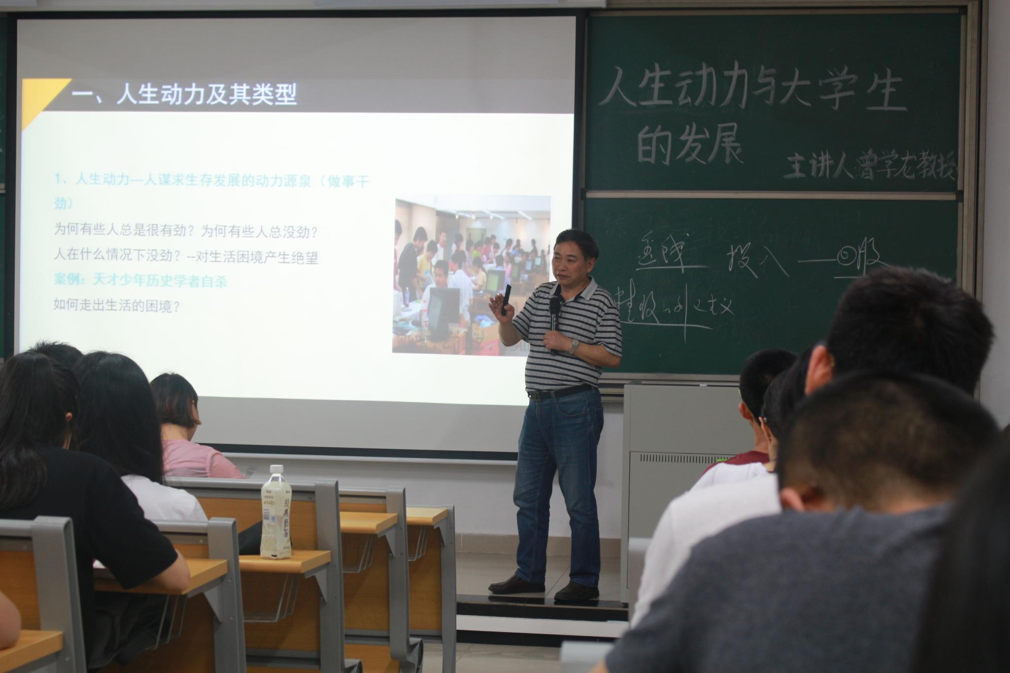 讲座伊始,余倩花老师向同学们介绍曾学龙教授并表示热烈欢迎。曾学龙教授首先提出“500年后的世界和50年后的中国是怎样的?”的问题,引发同学们思考,将同学们带进讲座的主题。接着,曾教授围绕“人生动力及其类型、人生动力与人生发展和人生动力的选择与确立”三个部分展开。他提出人生的动力源泉分功力动力和精神动力,强调人生发展需要人生动力,两者是并存的。寻找和确立人生动力需要做到四点:一是承认正当的功利追求,发挥其积极作用;二是培养正向精神动力;三是选择和实现自己的事业追求;四是选择自己的人生信条。最后他提出,大学生需要为自己的长远发展铸就精神动力——道义责任、感恩情怀、事业追求和科学信仰;大学生的长远发展最重要的是事业追求选择;大学生做到长远发展关键是科学信仰的确立。同时他也给同学们提出了务实思维、为民立场、辩证系统等方法。曾教授讲课的内容丰富,过程中还穿插了视频和图片,让同学们了解得更透彻,受益匪浅。
