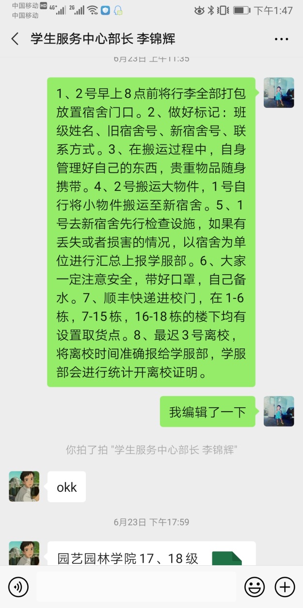 学生党员分工协作,层层设置负责人担任楼长,保证原宿舍每间行李全部搬走,新宿舍每间宿舍行李全部到齐,做好详细地登记,防止物件的丢失。流动志愿者纷纷前往新宿舍楼,帮助同学们搬迁行李,按照行李标签运至指定宿舍,自觉前往食堂为大家订餐,购买饮用水,保证搬迁过程中的能量补给。在搬迁过程中,有学生党员不小心受伤,前往医院包扎,立刻有同学主动担任志愿者,保证搬迁工作的正常开展。天气有些潮湿,有些闷热,时不时地小雨纷纷,同学们也都汗如雨下,但仍在一片欢声笑语中,你一言我一句的鼓励中,共同努力,于7月2日当天下午6点,全部搬迁完成。