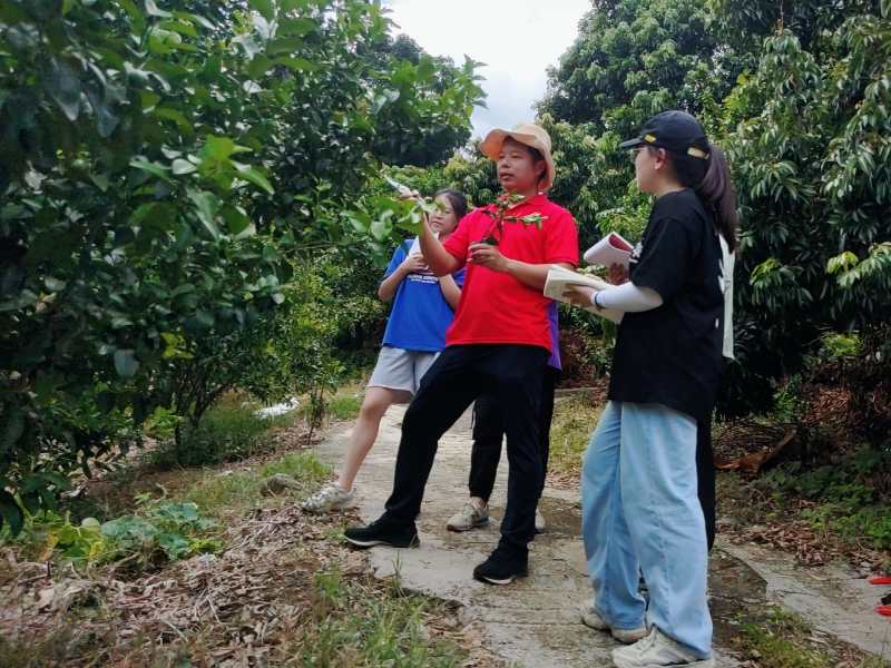 柑橘小分队在涂老师的带领下,来到位于从化区江浦街的上罗村。上罗村是一个以种植沙糖桔和红柿为主要产业的村庄,农户利用得天独厚的地理环境,极力种植高产、高品质的沙糖桔。通过与村书记、农户的交谈,队员们了解到当地沙糖桔产业的经营现状与发展前景。涂老师就沙糖桔种植给出了专业指导,并对当地沙糖桔产业发展提出建议,同时也给队员们上了一节专业实操课。