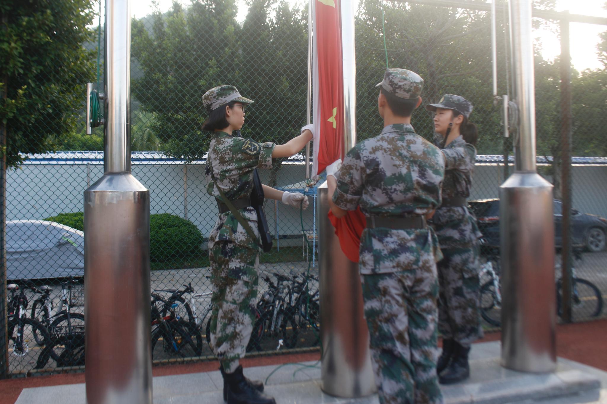升旗仪式开始,奏国歌,升国旗,全体人员庄严肃立,向国旗行注目礼,礼毕。