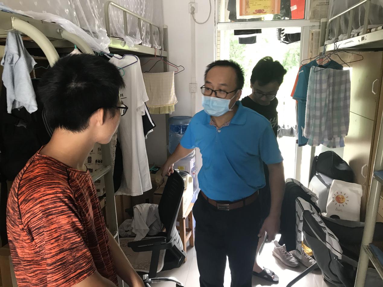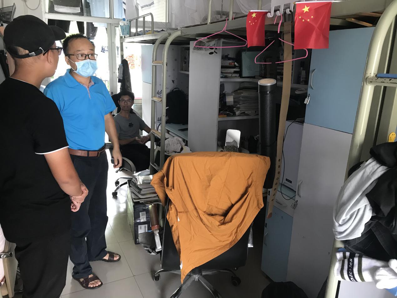 随后两位书记及三位辅导员老师走访学生宿舍进行防火防盗排查。书记们和辅导员老师们对违规电器和电瓶车电池进行重点排查,并提醒同学们注意用电安全,消除宿舍内的火灾隐患;保管好个人财物,出门前关好门窗。