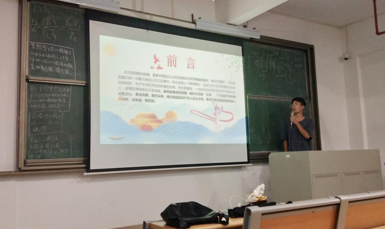 为了使新生更加了解党组织,更好地学习党员的先锋模范作用。2020年11月12日,园艺学生党支部于D栋401开展“红色育苗工程”之入党启蒙课堂:致敬疫情防控期间的英雄们,助班黄晓美以及草业201的全体新生参加此次课堂,学生党员段鑫龙同志为主讲人。