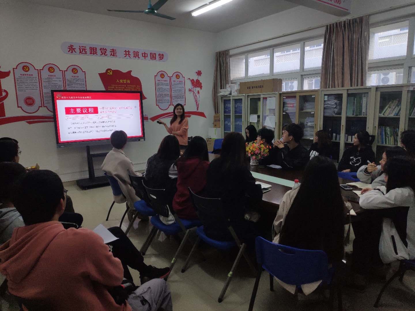 聂恺阳老师讲述了党的十九届五中全会会议的召开正值百年交汇之际,面对复杂多变的形势国家进行谋篇布局,这就是十九届五中全会召开的重要意义。接着聂恺阳老师为同学们介绍了这次大会的基本概况以及会议的主要精神。十九届五中全会的会议精神主要包括以下六个方面:“一个判断”“十大成就”“两层分析”“九大远景目标”“六大新目标”和“十二方面具体举措”在为同学们深入解析了本次大会之后,老师向同学们抛出了问题“我们应该如何贯彻落实党的十九届五中全会精神呢?”,学生党员纷纷结合自身积极发言,聂恺阳老师支出首先是要深入学习会议精神实质,提高政治站位和自身思想认识,其次是要学用结合,真正将会议精神落实到学习生活的方方面面。最后每位学生党员都要不忘初心,牢记使命,砥砺前行,有担当有作为。