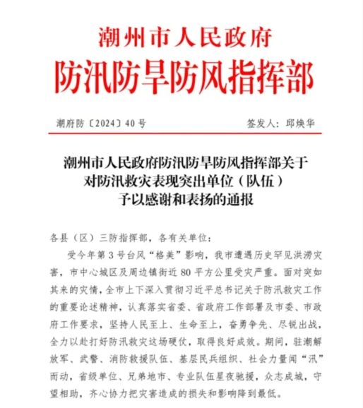 在潮州市人民政府防汛防旱防风指挥部关于对防汛救灾表现突出单位(队伍)予以感谢和表扬的通报里,williamhill英国潮韵绿行突击队与驻潮解放军、武警部队等45个单位(队伍)入选表扬名单,共同受到了潮州市人民政府诚挚的感谢与表扬!