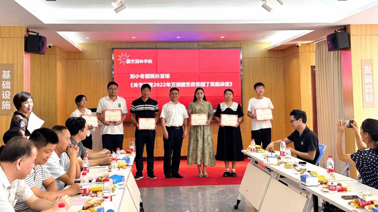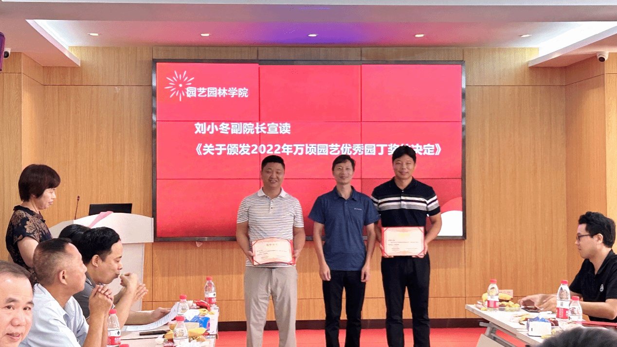 接着举行隆重的颁奖典礼,刘小冬宣读《关于颁发2022年万顷园艺优秀园丁奖的决定》;尹国强和李永泉为在教学科研、党建工作、青年教师教学竞赛等获奖的教师颁奖。