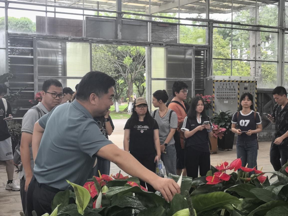 师生们首先前往广州花卉研究中心从化基地,在曾伟达高级农艺师引领下,参观了花卉组培生产、新品种展示、种苗和盆花标准化示范生产等现场,见证了红掌等高档花卉从组培苗到成品的科技化培育过程,感受了现代农业的规模化与高效化,科技对农业高质量发展的巨大推动力。