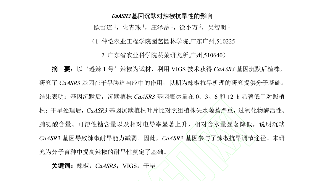 9月22日,我院化青珠、吴智明教师以‘遵辣1号’辣椒为试材,在《北方园艺》刊物联合发表了题为“CaASR3基因沉默对辣椒抗旱性的影响”文章,利用VIGS技术获得CaASR3基因沉默后植株,研究了CaASR3基因在干旱胁迫响应中的作用,为分子育种中提高辣椒耐旱性奠定了基础。