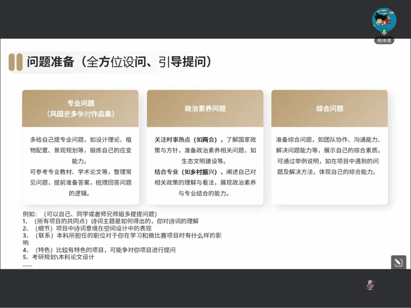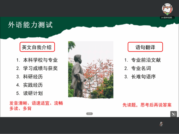 交流会分为经验分享与自由提问两个环节。在经验分享环节,四位师兄师姐依次发言。吴冰哲师姐详细介绍了复试流程和项目集准备的要点,强调了准备简历的重要性,并分享了面试时的心态调整技巧。杨坤清师兄则从复试信息获取渠道和科研素养的角度,为同学们提供了实用的备考建议。林涛师兄和伍泳媚师姐分别分享了复试调剂、英语口语备考和面试技巧,鼓励同学们保持自信、从容应对复试。