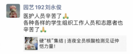 检测有序快速地结束,党员们纷纷报备负责班级的检测完成情况。学生志愿者们积极配合医护人员,认真履行了自己的岗位职责,积极维护现场秩序,帮助学生们顺利完成采样,耐心解答学生们提出的每一个问题。党员们纷纷感叹中国速度,向辛苦的白衣天使们致敬。
